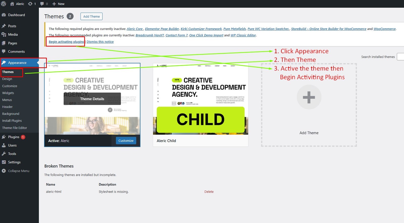 Appearance → Themes → Add New Click on “Choose File” and select aleric.zip