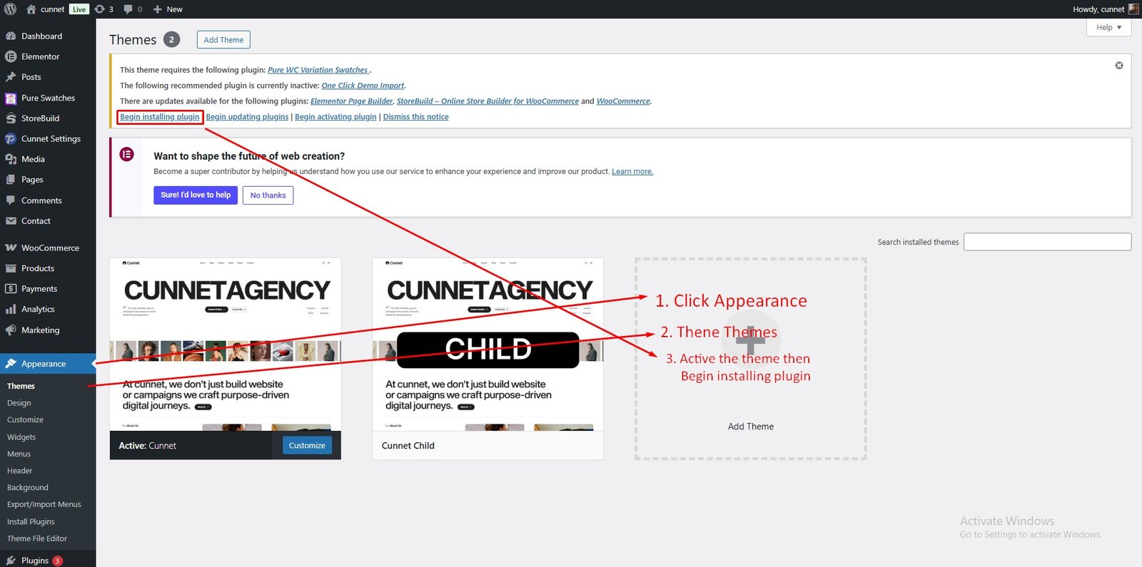 Appearance → Themes → Add New Click on “Choose File” and select cunnet.zip