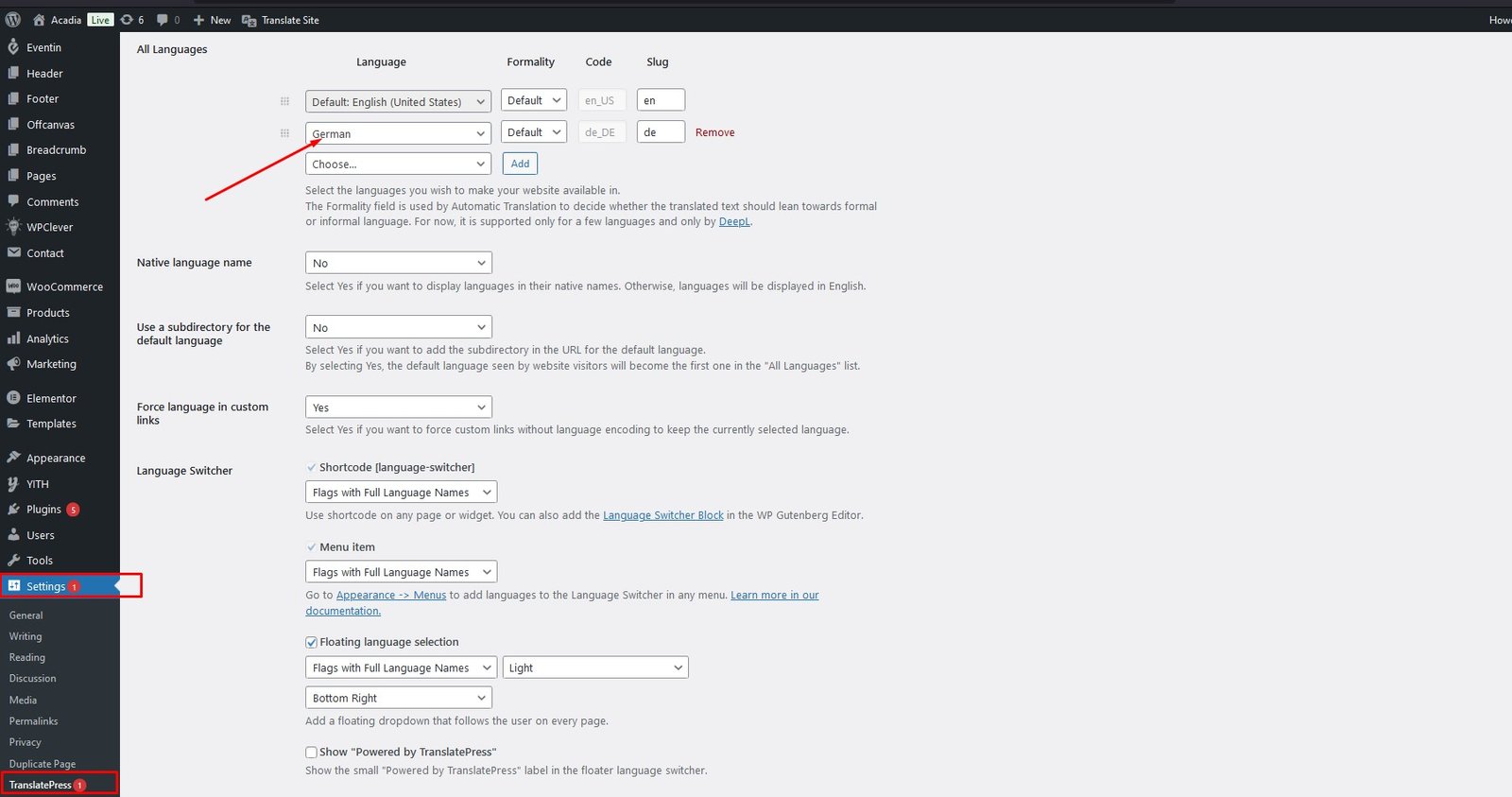 TranslatePress Settings Then select another language and click on "Save".